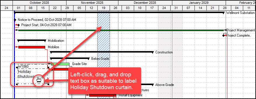In Figure 10, we left-click this text box and drag it into position over the Thanksgiving holiday shutdown curtain.
