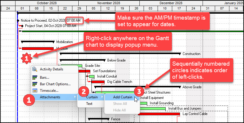 Next, we perform a series of left-clicks, indicated by sequentially numbered circular stamps, on the Gantt chart in Figure 5. The final left-click (3) in Figure 5 adds a curtain. Note the AM/PM timestamp for milestone tasks, as timestamps apply to all date labels.