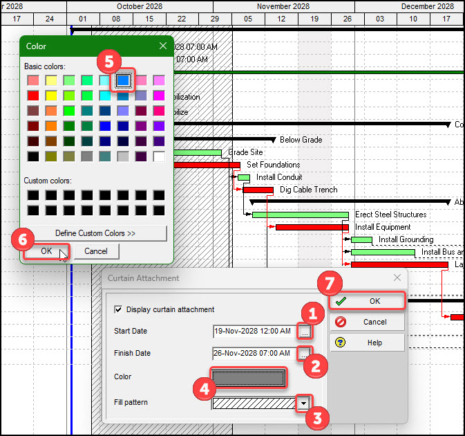 In Figure 6, we perform several clicks to (1) set the start and (2) set the finish dates of the curtains, (3) select the fill pattern, (4) modify its color, (5) choose the periwinkle color from the palette of basic colors, (6) click OK to exit the color palette, (7) click OK to complete insertion of the curtain with our settings.