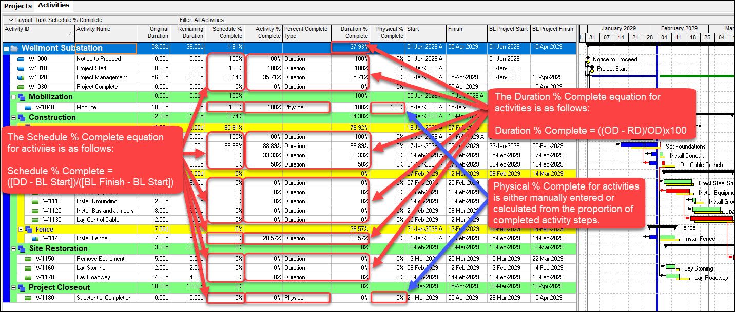 The Gantt chart makes for an efficient (or quick) judgment tool, while the activity table plan and progress columns are percentages on a 0 to 100 percentage scale and provide a more definitive numerical representation of schedule progress.