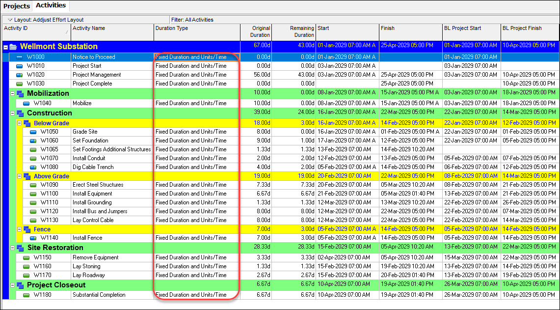 Figure 14 shows the resulting duration types for the schedule, confirming our desired Fixed Duration and Units/Time duration type.