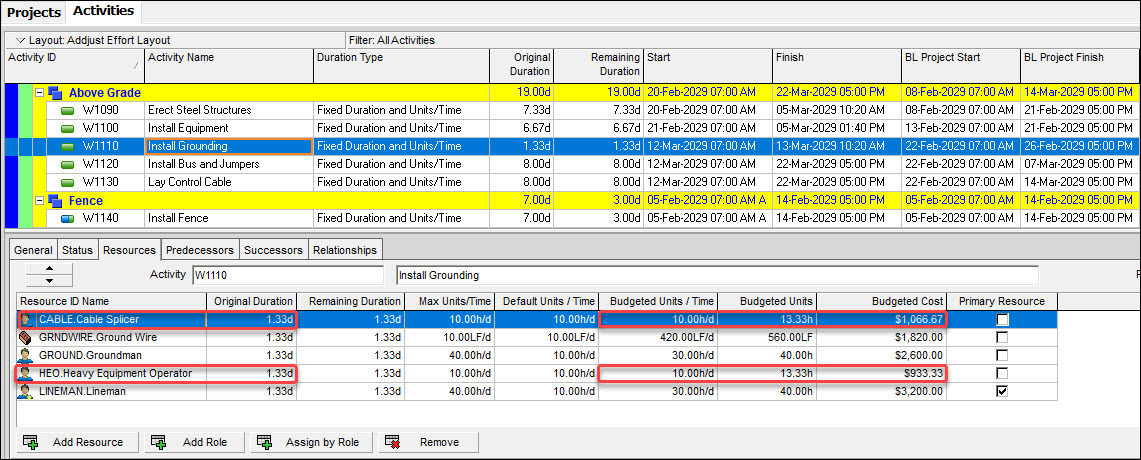 In our scenario, we couldn’t add an additional cable splicer or HEO; the Max Units/Time allowed only one full-time resource for each. However, an assessment of their daily efforts and required work indicated padding. It was appropriate to therefore reduce the cable splicer and HEO’s daily effort and work, respectively. In this way, the schedule aligned with the resource availability and the true required daily output.