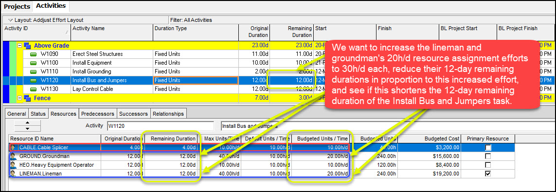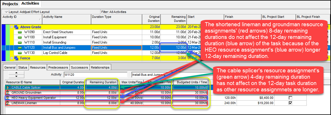 Why did our increased effort not affect the task’s duration? The problem is that the HEO resource assignment’s remaining duration stayed at 12 days, longer than the updated 8-day lineman and groundman remaining durations, and it is preventing the Install Bus and Jumpers task from shortening. (Note that the cable splicer’s 4-day remaining duration has no effect, as it is the shortest remaining duration for the Install Bus and Jumper’s resource assignments.)