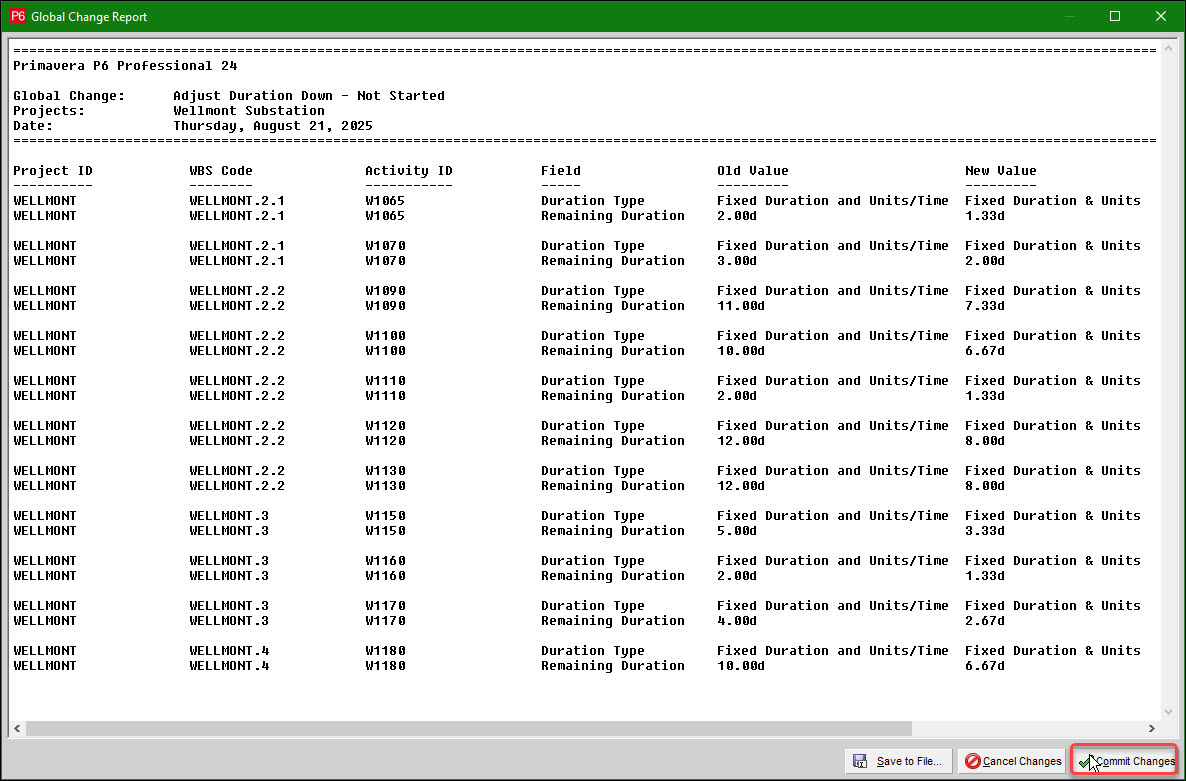 With our newly created ‘Adjust Duration Down – Not Started’ Global Change routine, we click the Apply Change button in Figure 8 to adjust the duration down for all not-started tasks.